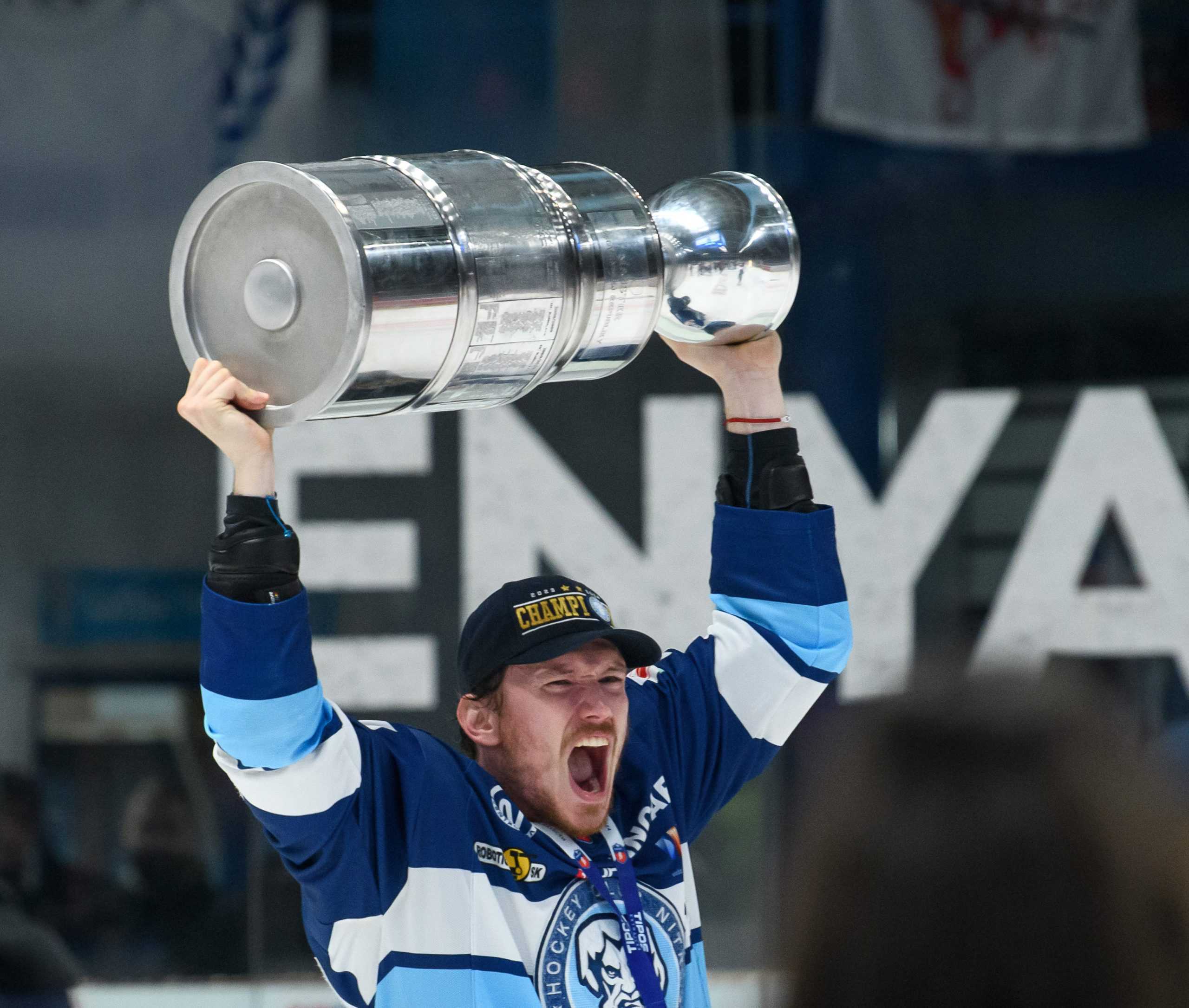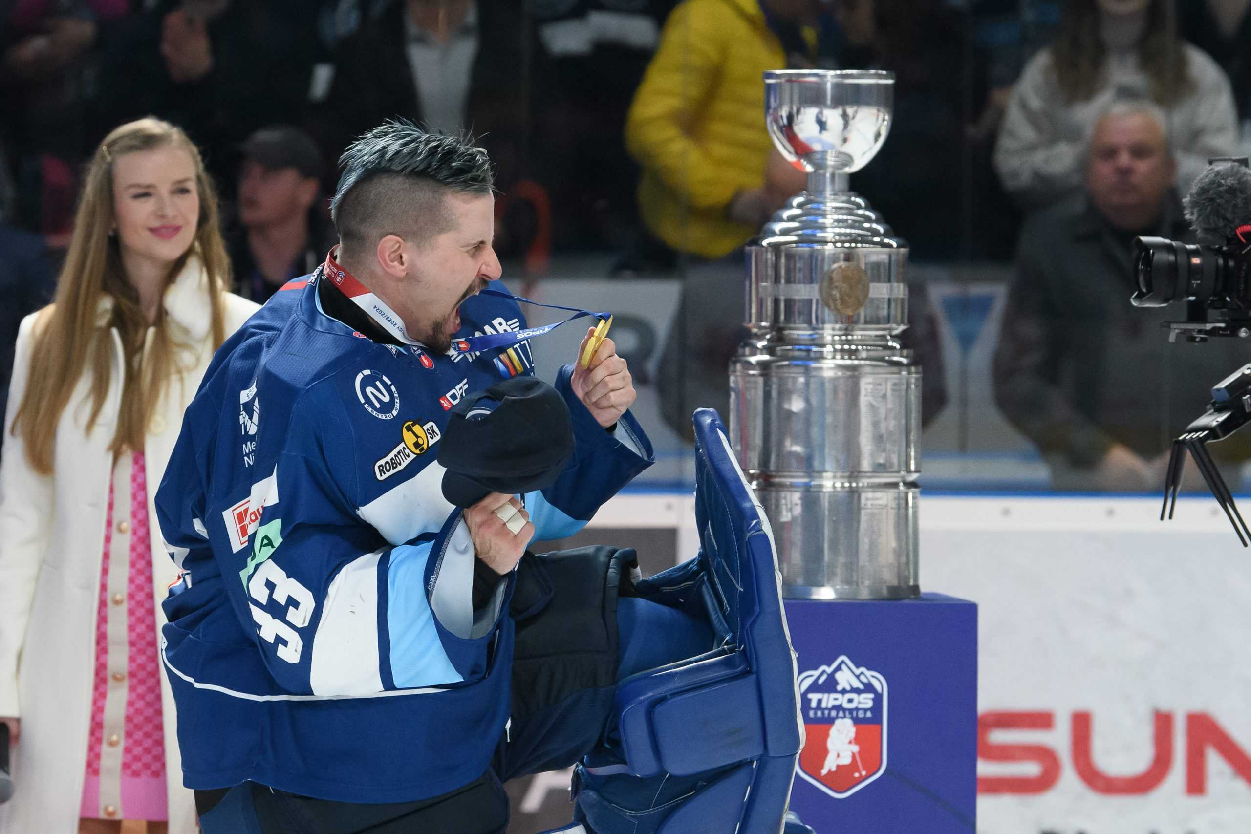 Samuel Buček dvíha nad hlavu trofej pre slovenského hokejové majstra.