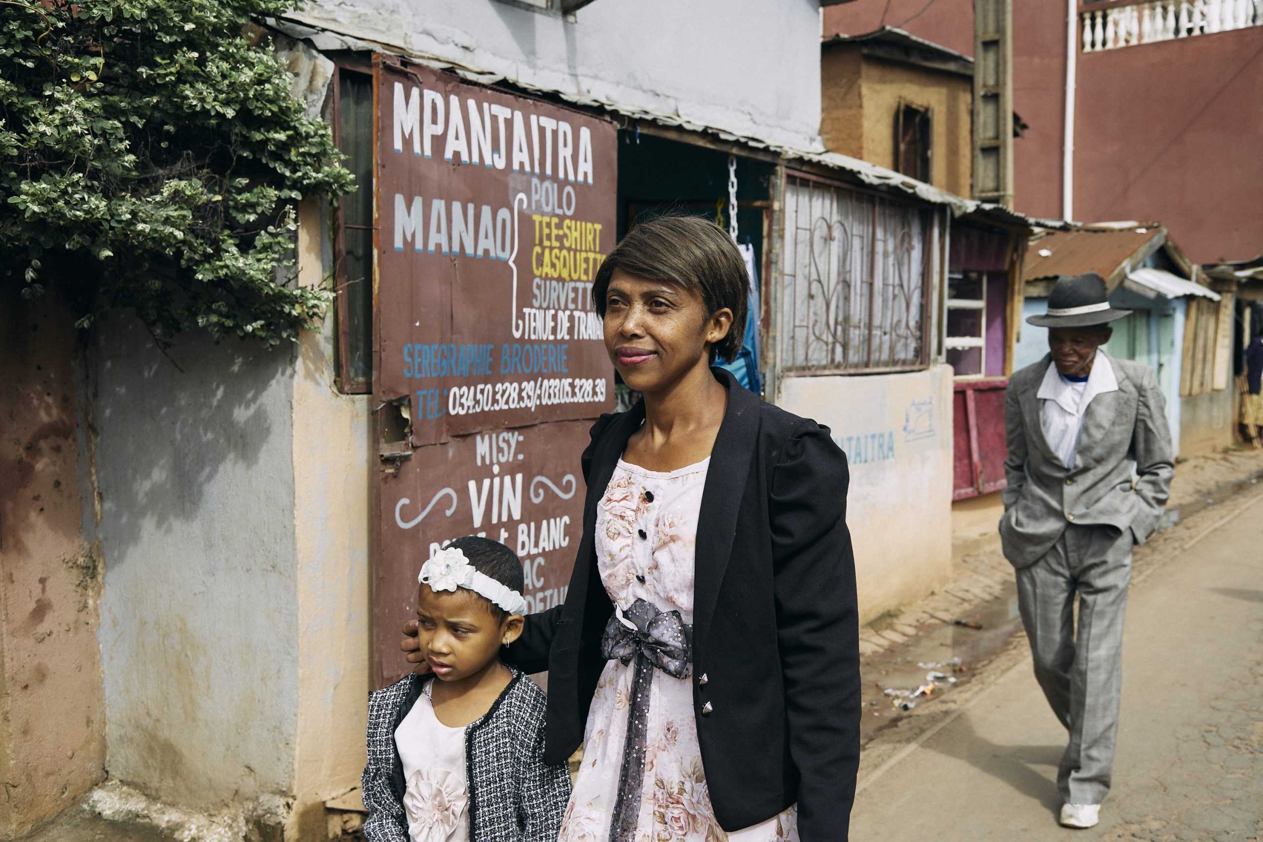 Fara Rafaraniriana kráča v nedeľu ráno do kostola s dcérou Odliatemix a otcom Dada Paulom.