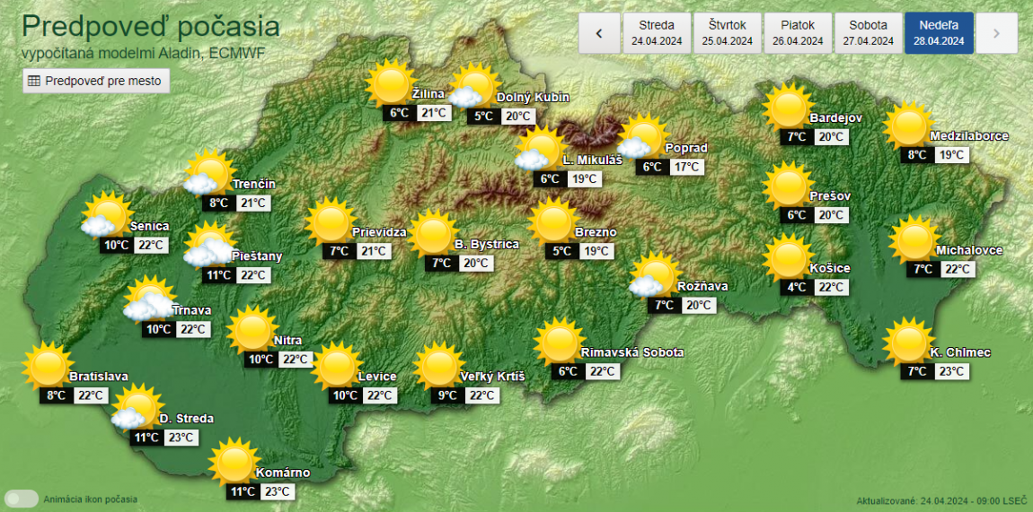 „Najnižšia nočná teplota 14 až sedem stupňov, spočiatku v údoliach okolo päť stupňov. Najvyššia denná teplota 20 až 26 stupňov,“ uvádza ústav v predpovedi na začiatok budúceho týždňa.