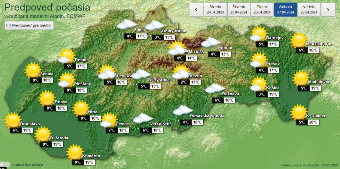 V sobotu (27. 4.) už bude ráno o niečo teplejšie. Teploty klesnú na päť až nula stupňov, na juhu Banskobystrického kraja bude o čosi teplejšie. „Od juhovýchodu až východu k nám bude zasahovať tlaková výš a po jej zadnej strane bude od juhozápadu do našej oblasti prúdiť teplý vzduch,“ opísali situáciu meteorológovia.