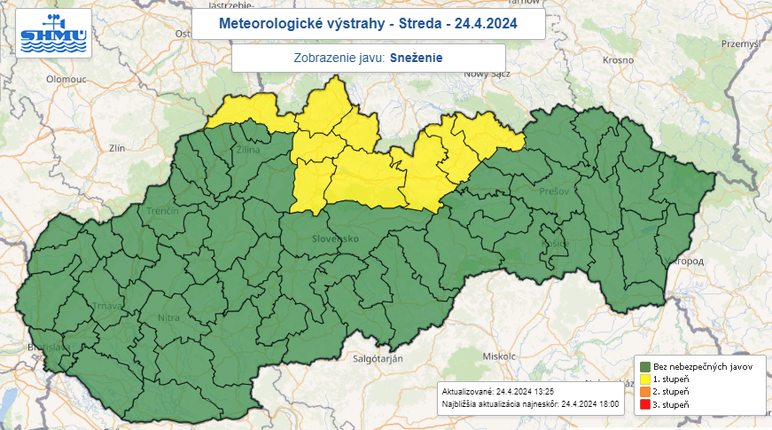 Sneženie zasiahne severné okresy Slovenska na Kysuciach, Orave, Liptove, v Tatrách a na Zamagurí. Varovanie pred snežením, počas ktorého môže spadnúť až päť centimetrov nového snehu, platí od stredy (24. 4.) 17.00 do 7.00 alebo 8.00 h vo štvrtok (25. 4.).
