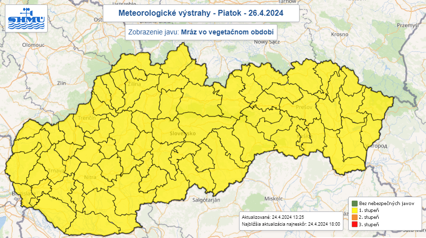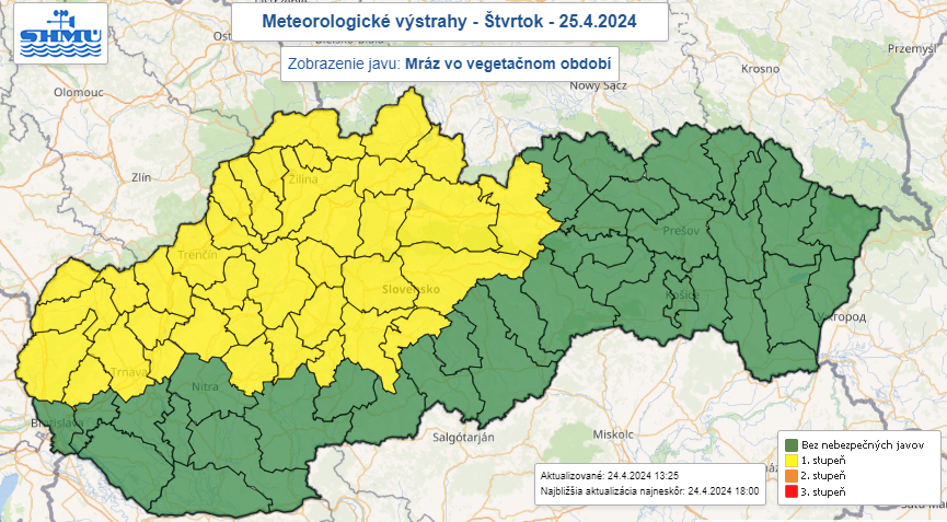 V noci na štvrtok a piatok (26. 4.) a v ranných hodinách sa navyše môže vyskytnúť prízemný mráz. Výstrahou prvého stupňa pred ním SHMÚ varuje vo štvrtok od polnoci do 6.00 h alebo 7.00 h v okresoch na severozápade a severe stredného Slovenska.