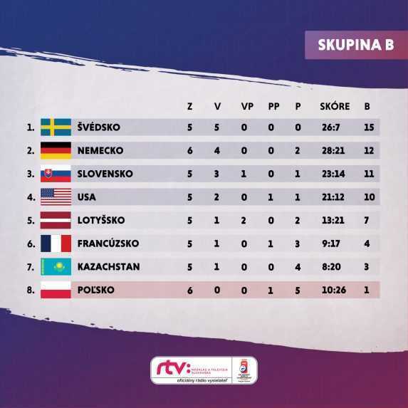 Slovensko má po piatich zápasoch v základnej B skupine hokejových majstrovstiev sveta v Česku na konte 11 bodov a postup do štvrťfinále má pevne vo svojich rukách. Potvrdiť ho môže už v nedeľu v zápase s Lotyšskom. Postupová matematika je v tomto smere pomerne jednoduchá – akékoľvek víťazstvo nad Lotyšmi nás posunie do vyraďovacej časti turnaja.