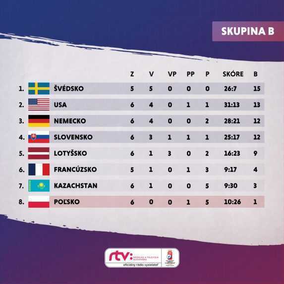 Slováci potrebujú na štvrťfinále získať aspoň bod v utorkovom večernom poslednom zápase základnej časti proti Švédsku. Tri korunky majú ešte v pondelok na programe duel s Francúzskom, v ktorom ak potvrdia rolu favorita, do zápasu so Slovenskom pôjdu už ako istý víťaz skupiny.