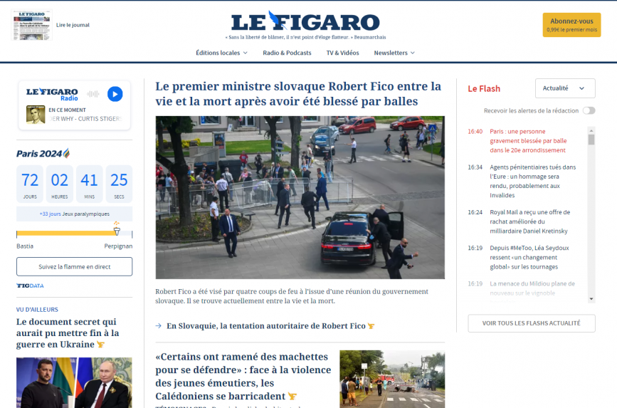 „Slovenský premiér Robert Fico bol po rokovaní vlády SR štyrikrát postrelený. Momentálne je medzi životom a smrťou,“ informuje francúzsky denník Le Figaro.