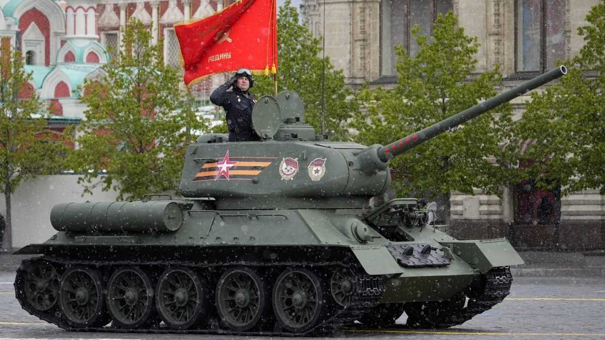 Legendárny sovietsky tank T-34 s červenou vlajkou na vrchole na Červenom námestí v Moskve počas vojenskej prehliadky.