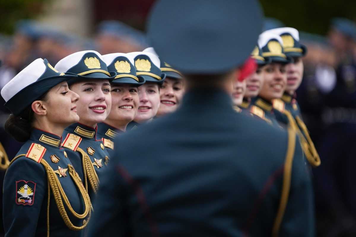 Ruské vojačky pochodujú počas vojenskej prehliadky na Deň víťazstva v Moskve.