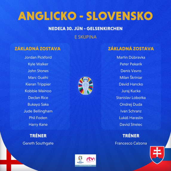 Slovenská futbalová reprezentácia sa na EURO stretne po ôsmich rokoch s Anglickom. V osemfinále sa Slováci pokúsia vybojovať historický postup do štvrťfinále. Úvodný výkop je na štadióne v Gelsenkirchene naplánovaný na 18.00 h.