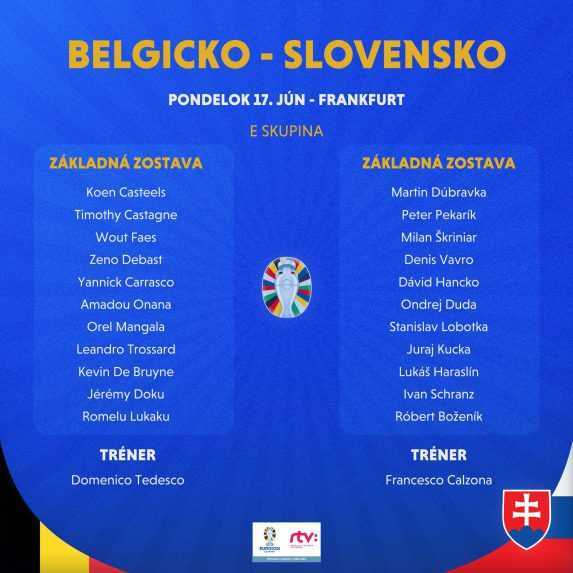 Slovenskí futbaloví reprezentanti začnú svoje pôsobenie na Majstrovstvách Európy v Nemecku v E skupine zápasom proti favorizovanému Belgicku. Slováci nastúpia vo formácii 4-3-3. Do brány sa postaví brankár anglického tímu Newcastle United Martin Dúbravka. Pred ním v obrane sprava nastúpi Peter Pekarík, Milan Škriniar, Denis Vavro a Dávid Hancko.