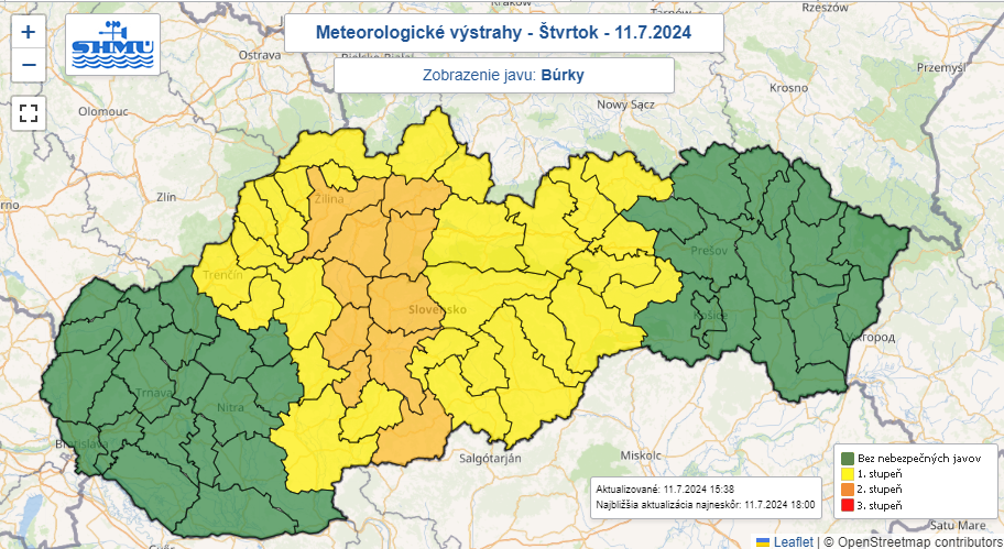 Druhý stupeň výstrahy platí vo štvrtok (11. 7.) do 17.00 h v okresoch Banská Bystrica, Banská Štiavnica, Veľký Krtíš, Zvolen, Žiar nad Hronom, Dolný Kubín, Martin, Ružomberok, Turčianske Teplice a Žilina.