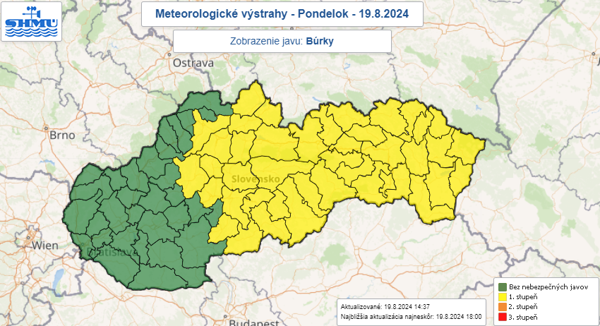 Výstrahy prvého stupňa pred búrkami rozšírili meteorológovia v pondelok (19. 8.) popoludní o okresy Žilina, Martin, Turčianske Teplice, Prievidza a Žiar nad Hronom.