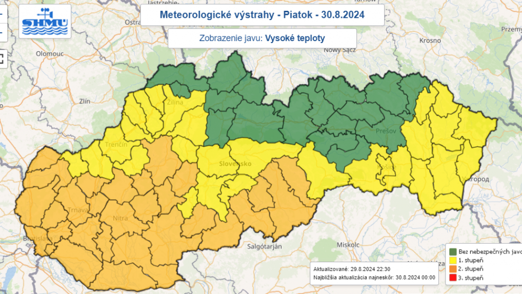 Výstrahy prvého stupňa platia pre väčšinu okresov Trenčianskeho kraja a niektoré okresy Banskobystrického, Žilinského a Prešovského kraja. Lokálne tam môže teplota dosiahnuť 33 až 34 stupňov Celzia.