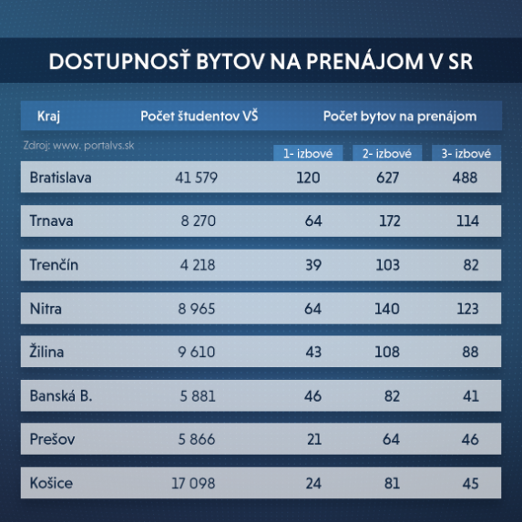 Na nájomnom trhu je relatívne málo voľných nájomných bytov. Rekonštrukcie internátov vyradili dočasne z ponuky približne 1300 lôžok, čo je alarmujúce číslo.