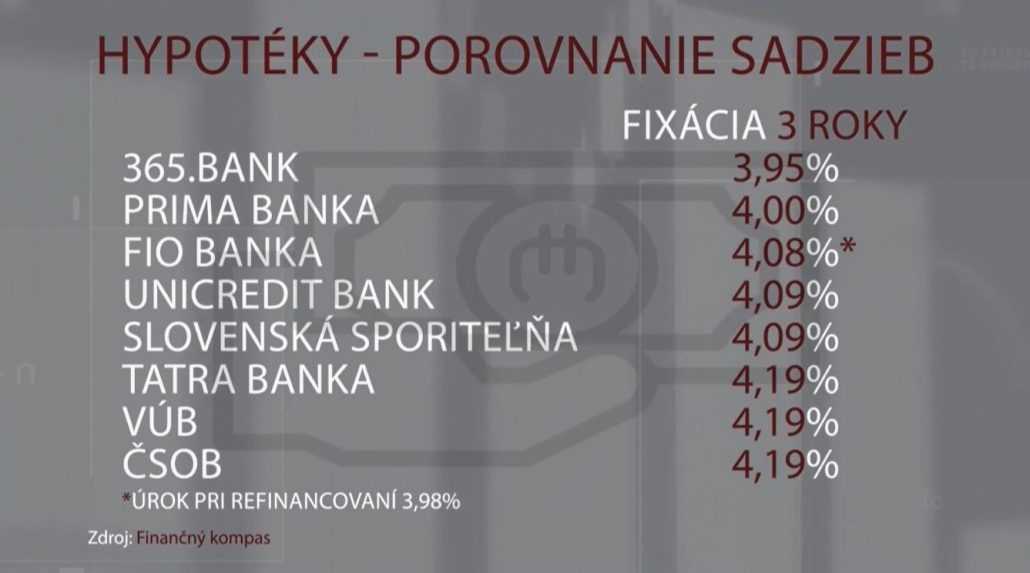 Úrokové sadzby hypoték sa líšia od banky k banke. V relácii Peniaze sme vám priniesli ich prehľad. Úrok tesne pod štyri percentá nájdete v súčasnosti v dvoch bankách, pričom v jednej z nich ho dostanete len v prípade refinancovania úveru. To znamená, že si úver prenášate z inej banky. Téme sme sa venovali v relácii Peniaze.