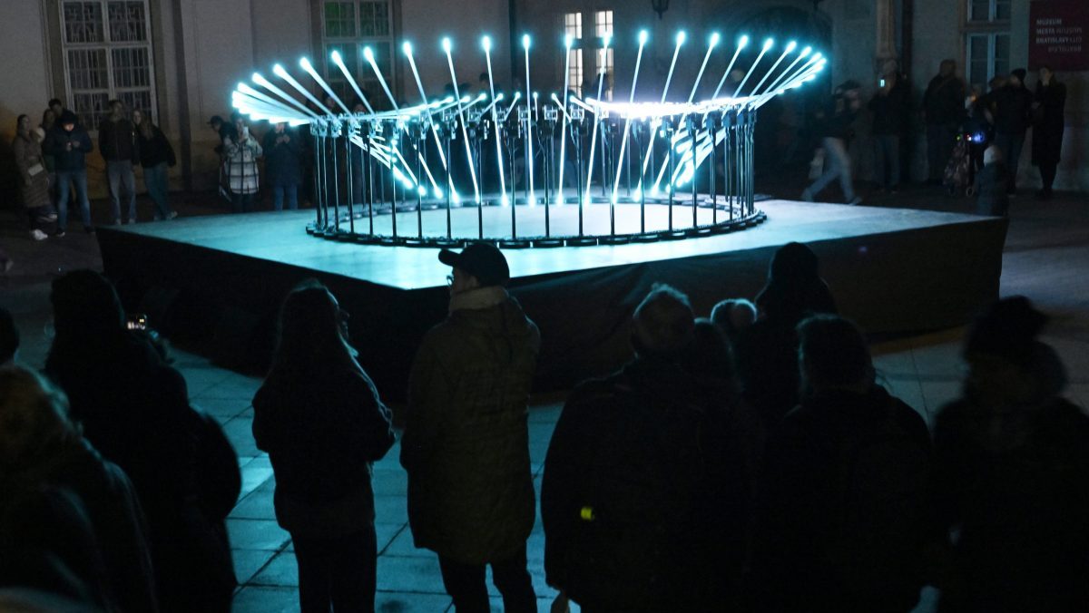 Snímka z kinetickej svetelnej inštalácie na Primaciálnom námestí v Bratislave.