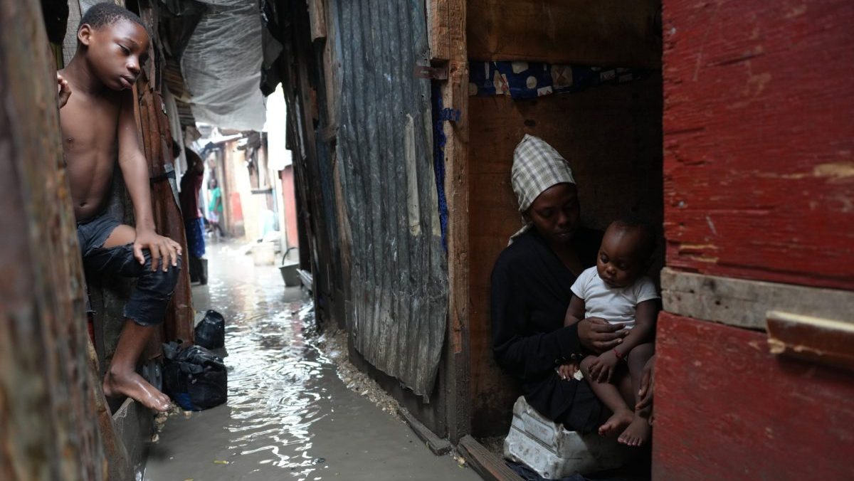 Ľudia v zaplavenom útulku pre rodiny vysídlené gangovým násilím v Port-au-Prince na Haiti.