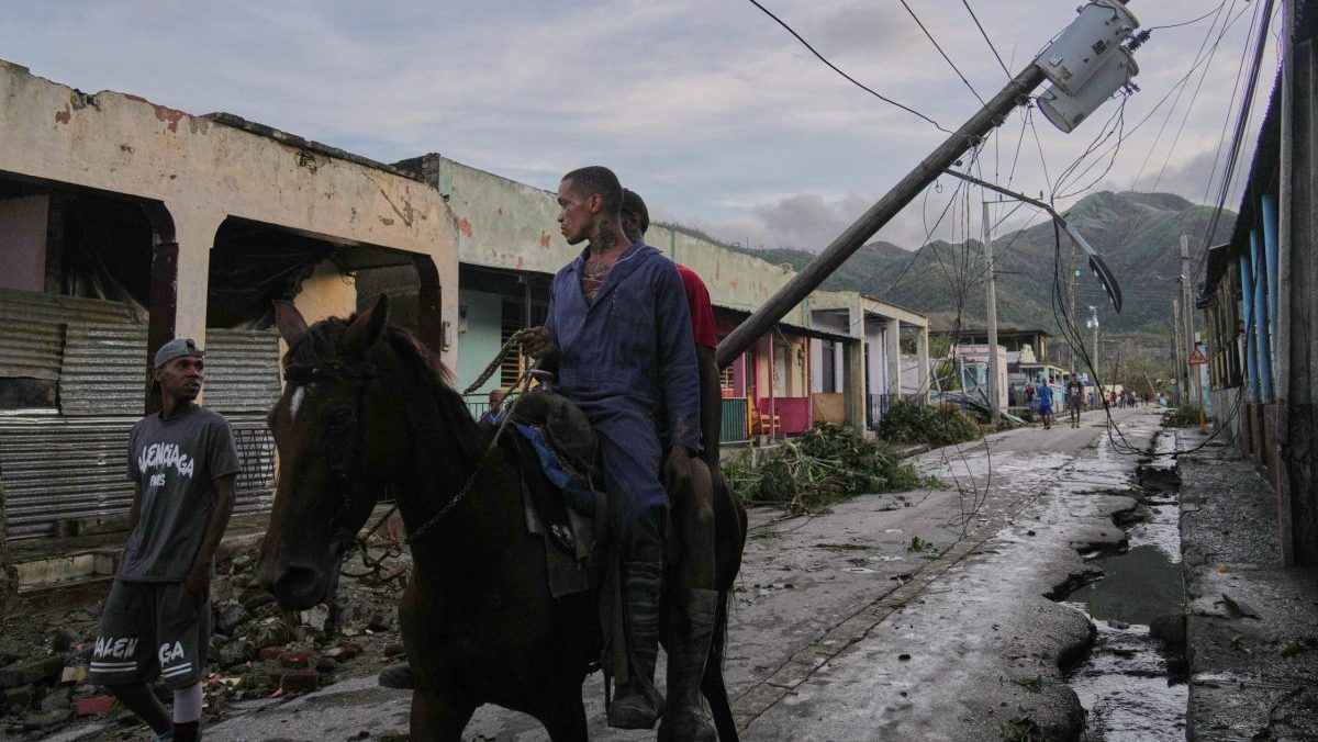 Muži na koni v uliciach El Cobre na Kube po hurikáne Melissa.