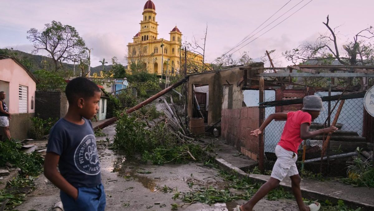 Chlapci kráčajú v El Cobre na Kube po prechode hurikánu Melissa.