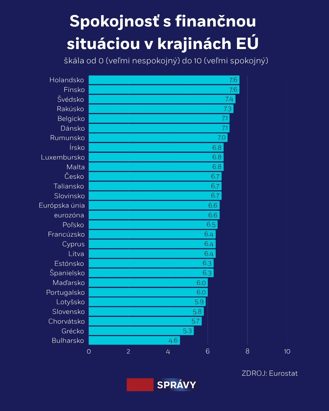 Najspokojnejší so svojou finančnou situáciou sú Holanďania a Fíni (obe krajiny s hodnotou 7,6). Za nimi nasledovali Švédi (7,4) a Rakúšania (7,3). Najnižšie hodnotili svoju finančnú spokojnosť Bulhari (4,6), Gréci (5,3), Chorváti (5,7), Slováci (5,8), Maďari (6,0) a Lotyši (5,9).