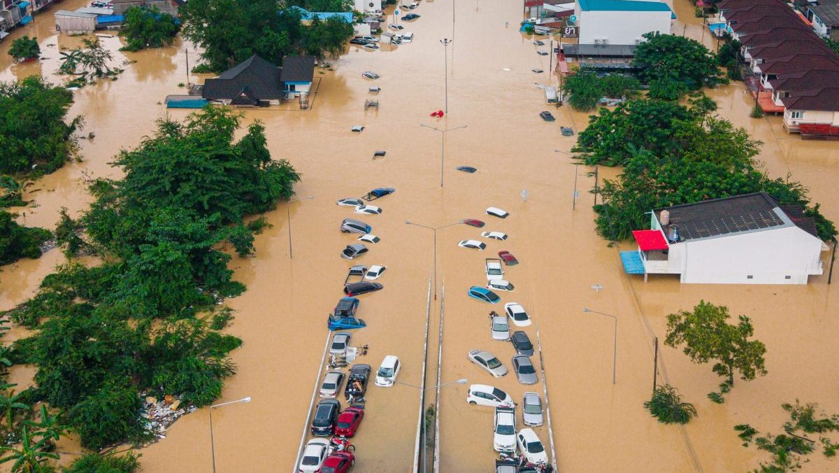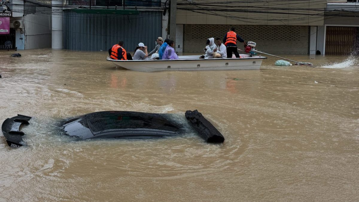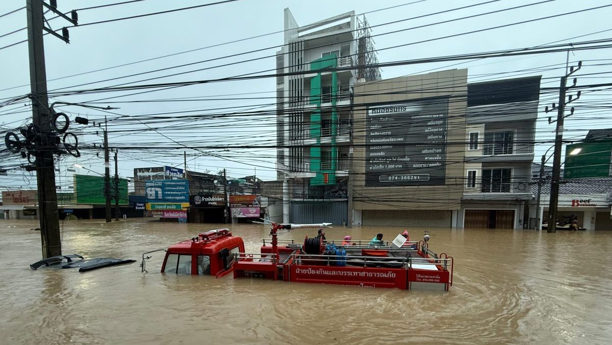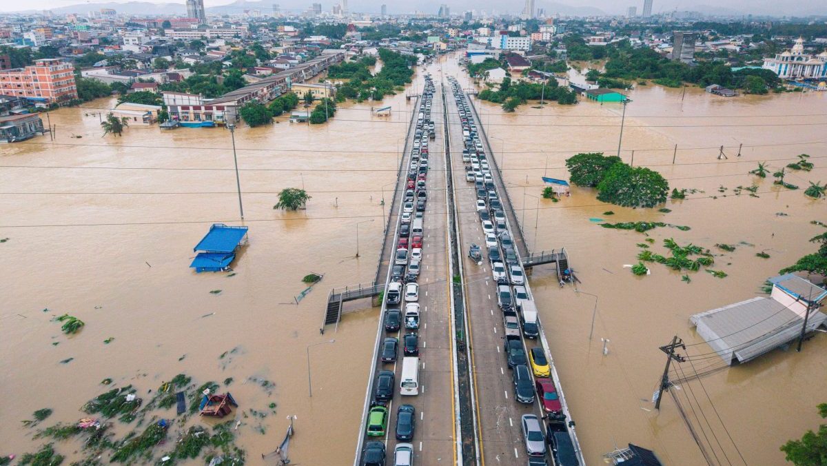Autá a domy sú zaplavené povodňovou vodou na juhu Thajska.