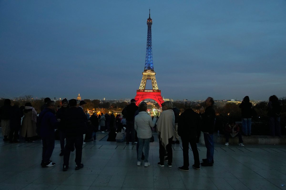 Eiffelova veža je osvetlená farbami francúzskej štátnej vlajky.