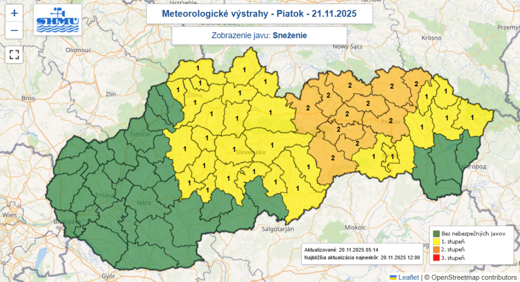 Druhý najvyšší stupeň varovania pred vysokým úhrnom snehových zrážok platí na východe a strednom Slovensku v jedenástich okresoch. Prvý stupeň platí pre Abov, Horný Zemplín, Liptov, Oravu, Kysuce a Horehronie.