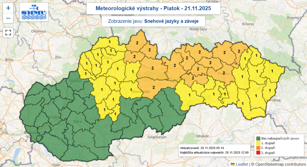 Snehové jazyky a záveje sa budú tvoriť v Banskobystrickom, Košickom, Prešovskom a Žilinskom kraji, kde platí druhý stupeň výstrahy. Prvostupňové varovanie platí pre severnú časť Trenčianskeho kraja.