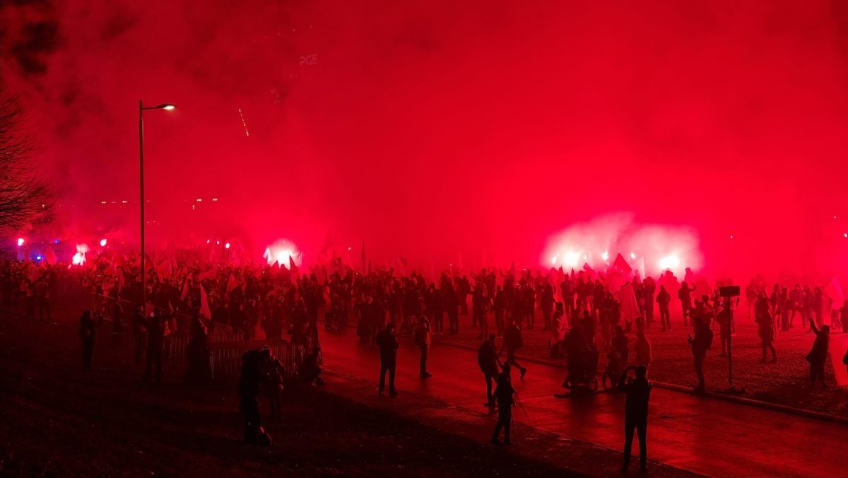 Ľudia držia dymovnice na Pochode nezávislosti vo Varšave.