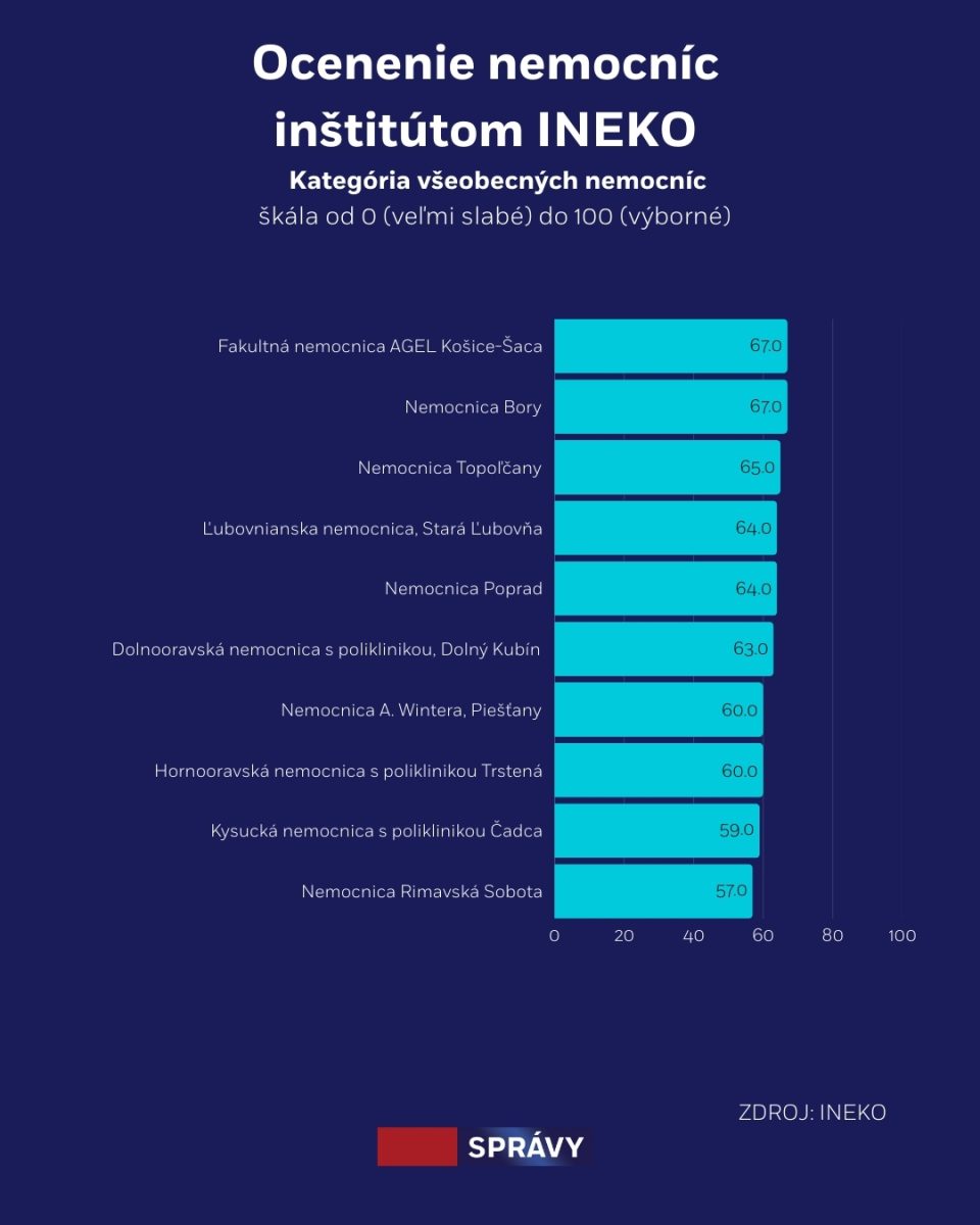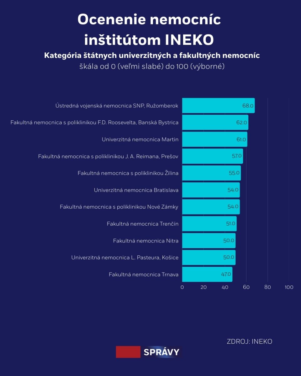 Najlepšou nemocnicou na Slovensku, spomedzi štátnych univerzitných a fakultných nemocníc, sa aj v roku 2025 stala vojenská nemocnica v Ružomberku. V kategórii všeobecných nemocníc sa na prvom mieste umiestnila Fakultná nemocnica AGEL v Košiciach. Vyplýva to z hodnotenia Inštitútu pre ekonomické a sociálne reformy (INEKO).