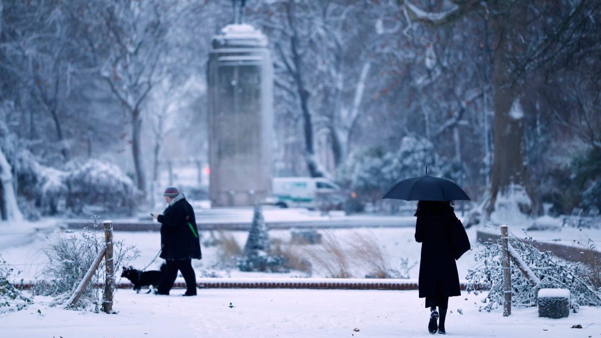 Ľudia venčia svojich psov v zasneženom Paríži.