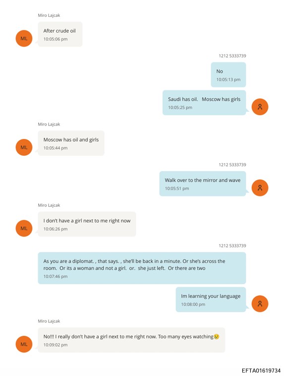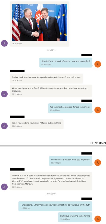 Konverzácia z novembra 2018: V sprostredkovanej komunikácii Lajčák spomína, že pre dianie v parlamente možno príde o ministerský post. Epstein mu ponúka miesto u seba.