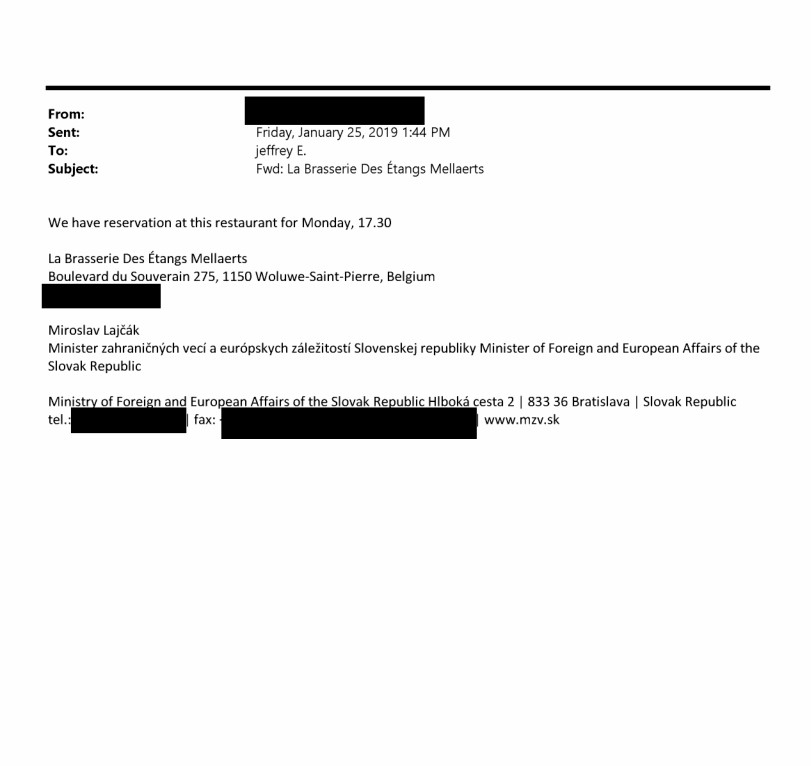 Konverzácia z januára 2019: Lajčák oznamuje Epsteinovi potvrdenie rezervácie v reštaurácii v Belgicku.