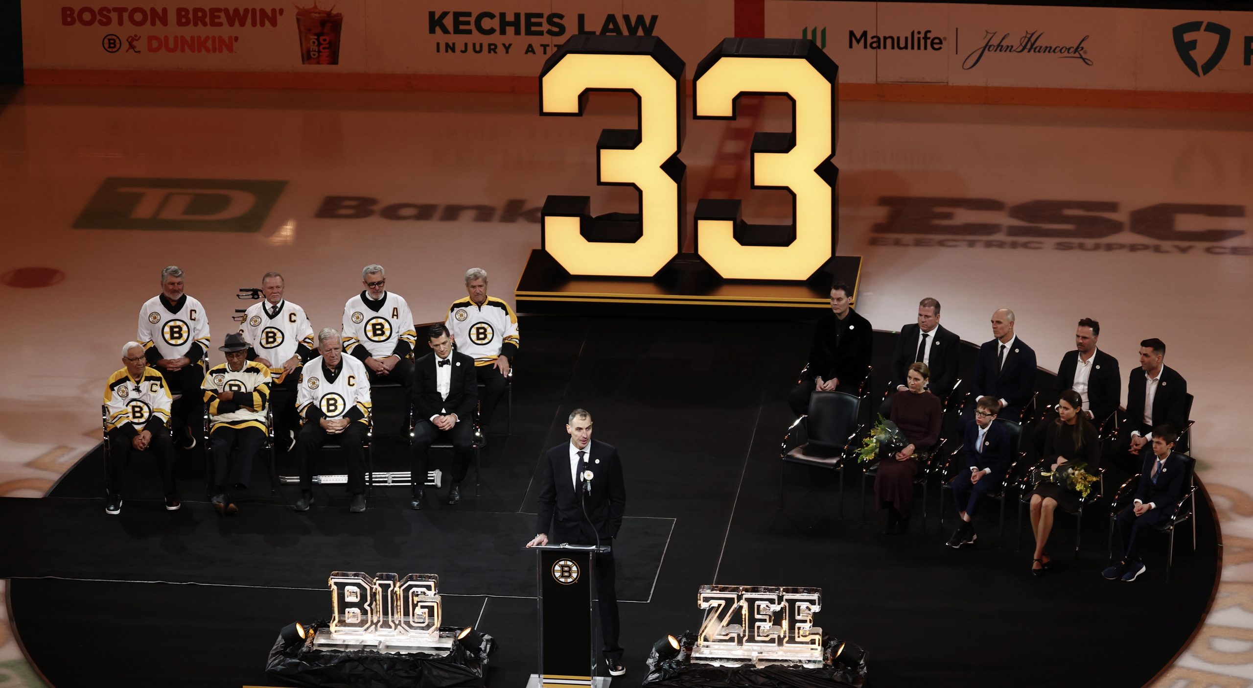 Zdeno Chára s rodinou počas slávnostného ceremoniálu, počas ktorého slávnostne vyvesili jeho dres s číslom 33.