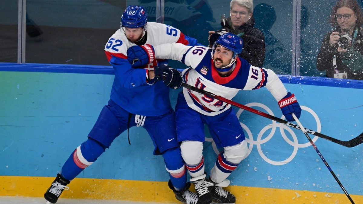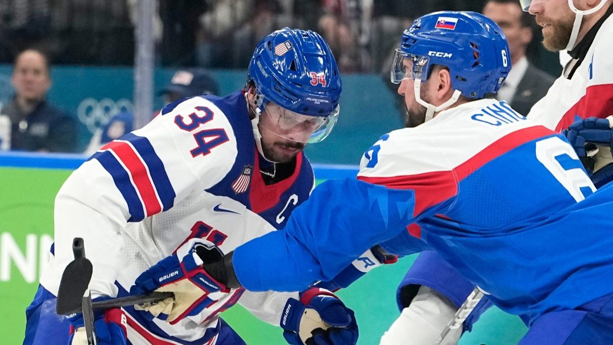 Martin Marinčin a Matthew Tkachuk v súboji v semifinálovom dueli na ZOH 2026.