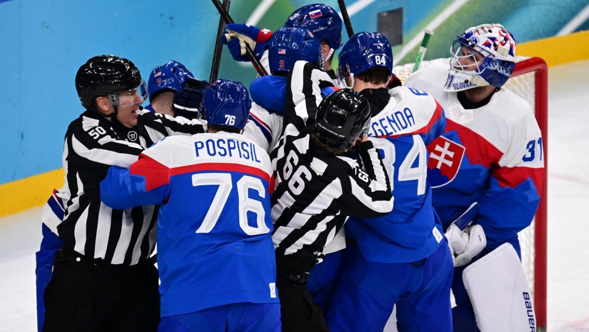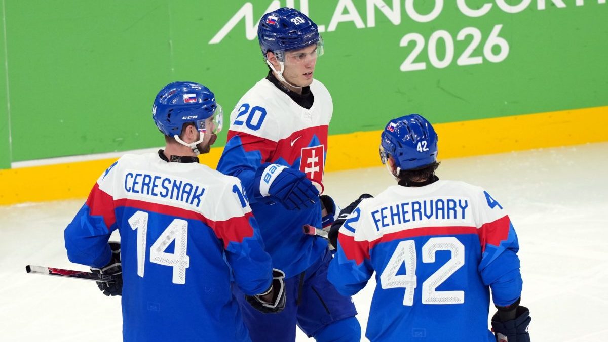 Slováci oslavujú gól v semifinále na ZOH 2026.