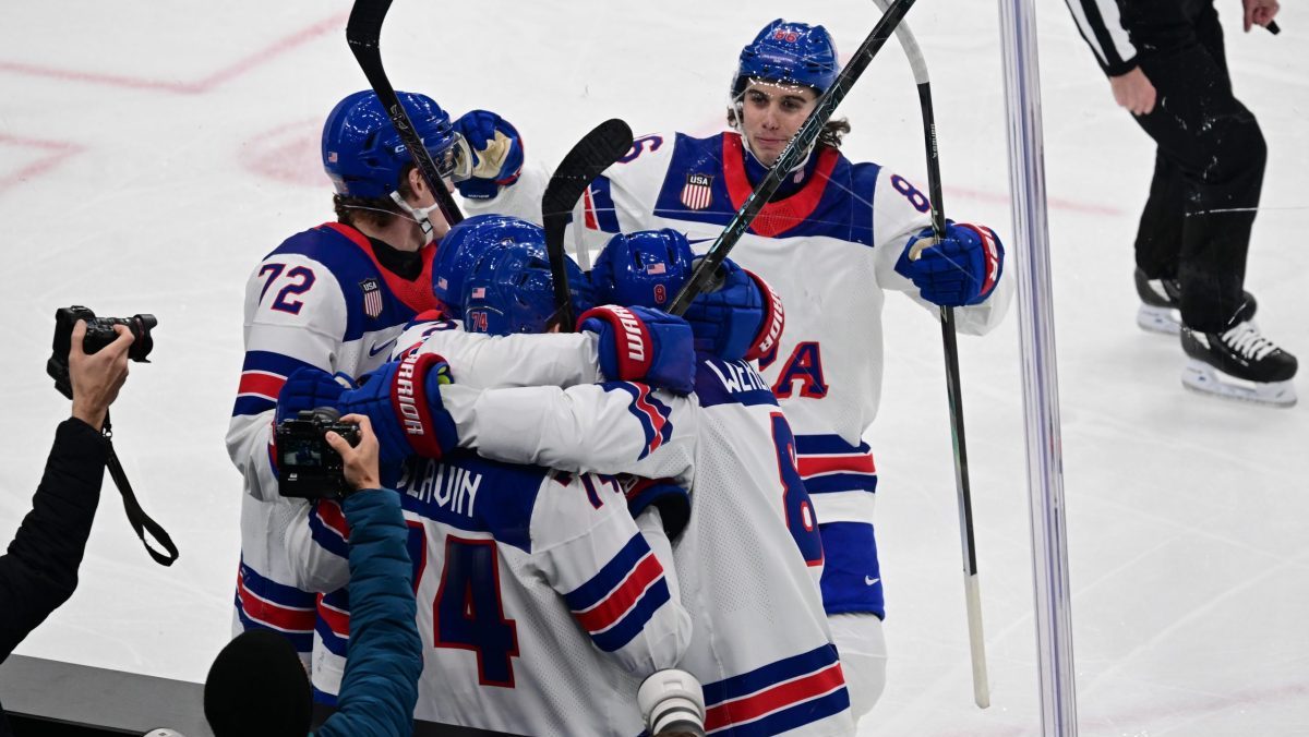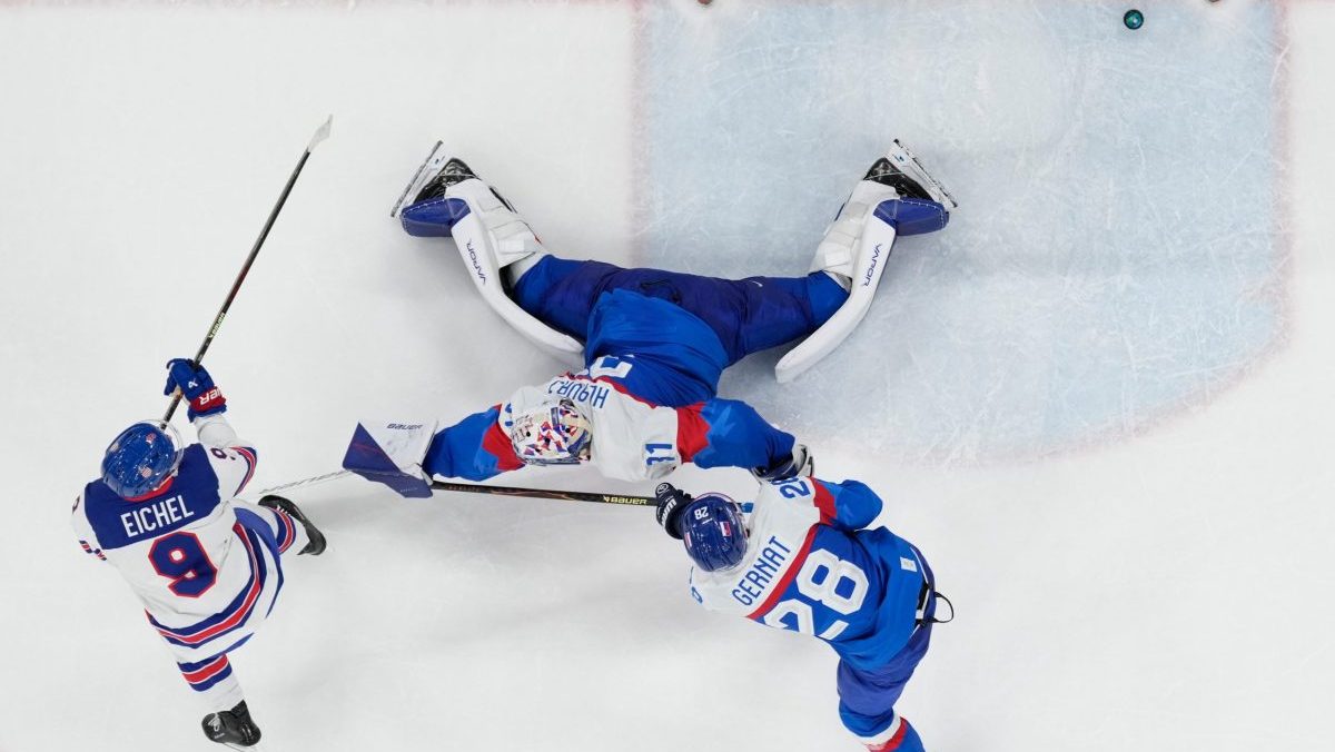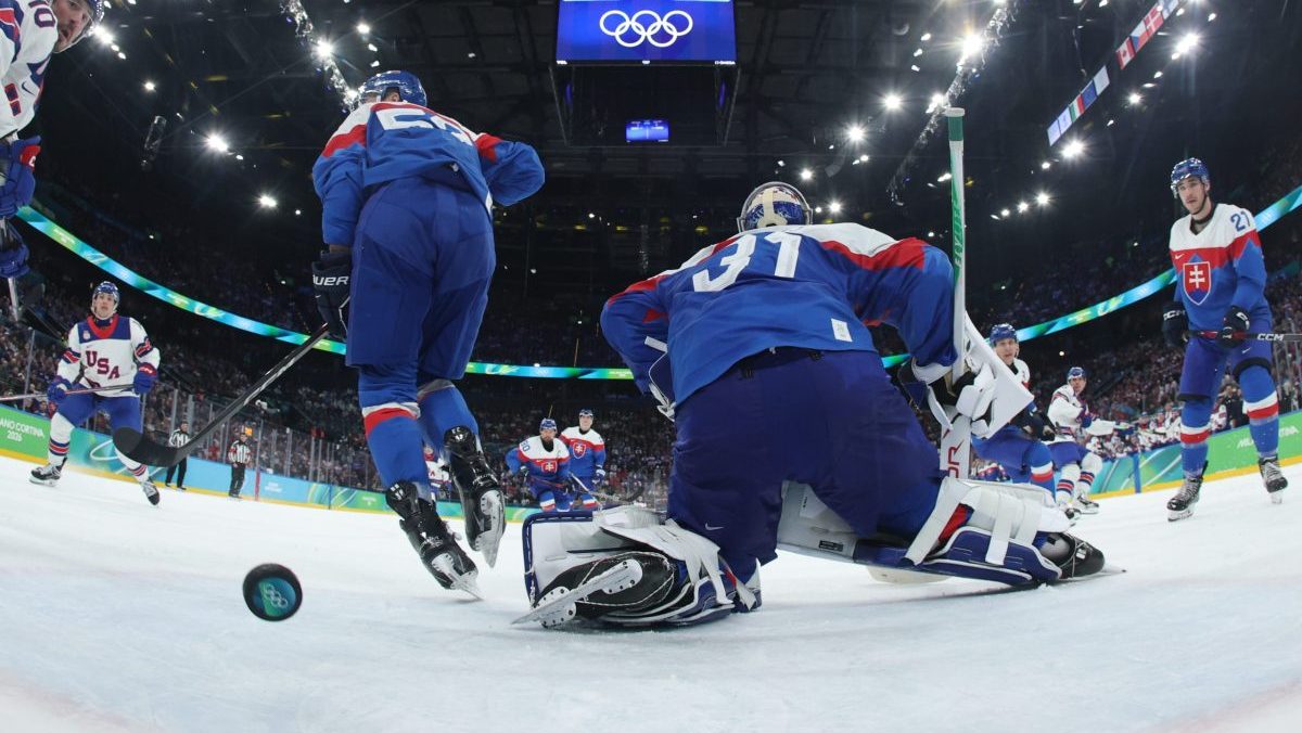 Samuel Hlavaj inkasuje gól proti USA v semifinále na ZOH 2026.