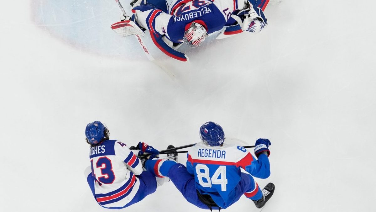 Quinn Hughes a Pavol Regenda v semifinále ZOH 2026
