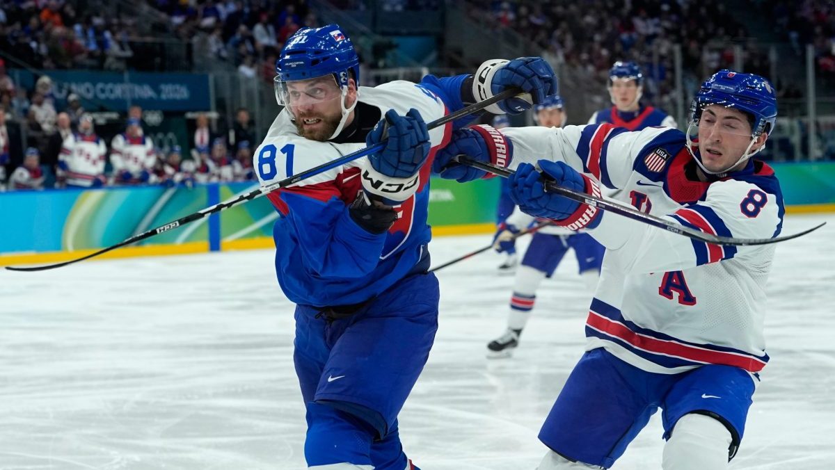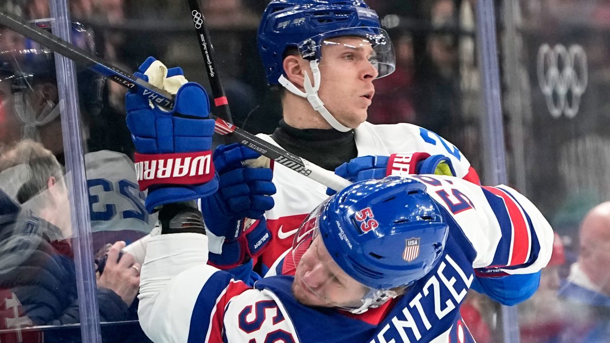 Auston Matthews a Lukáš Cingel v semifinále na ZOH 2026.