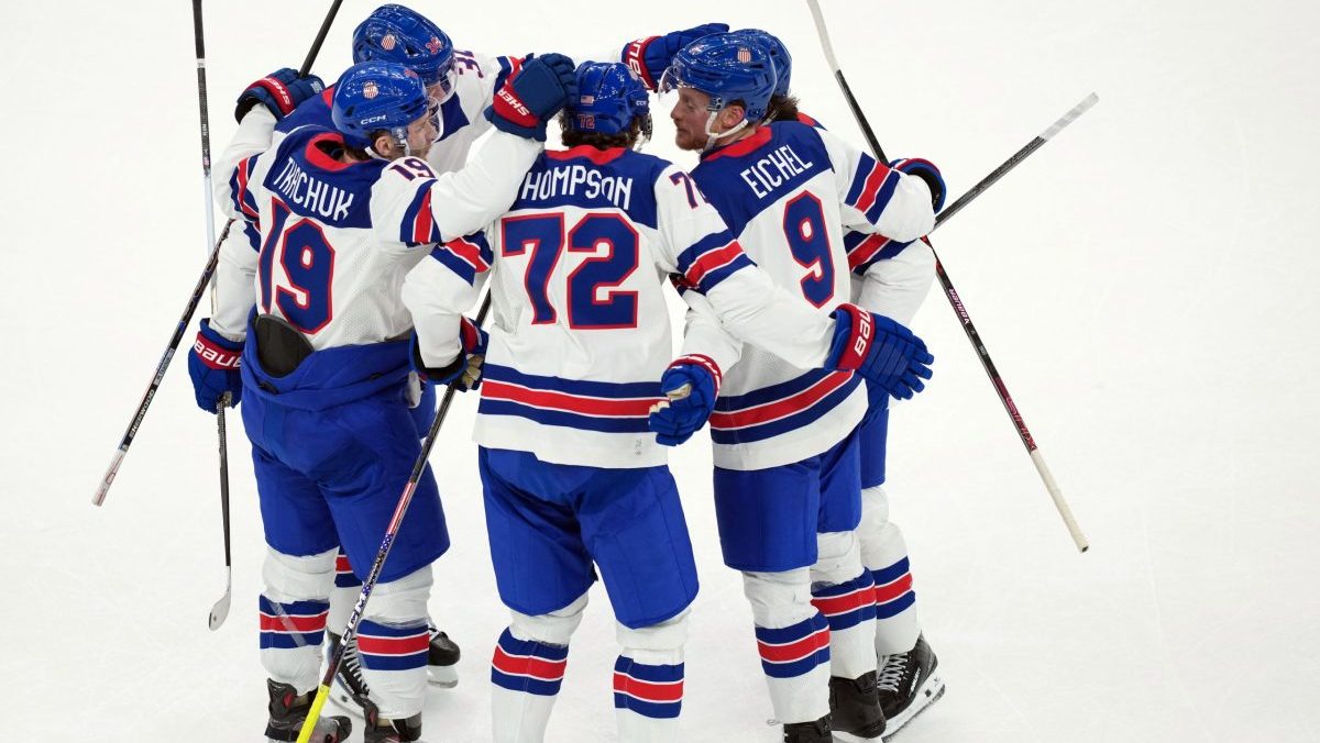 Američania oslavujú gól v semifinále ZOH 2026.