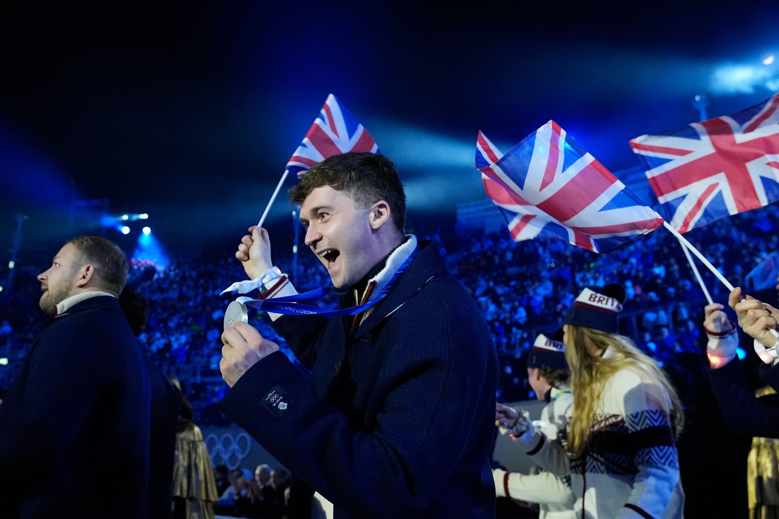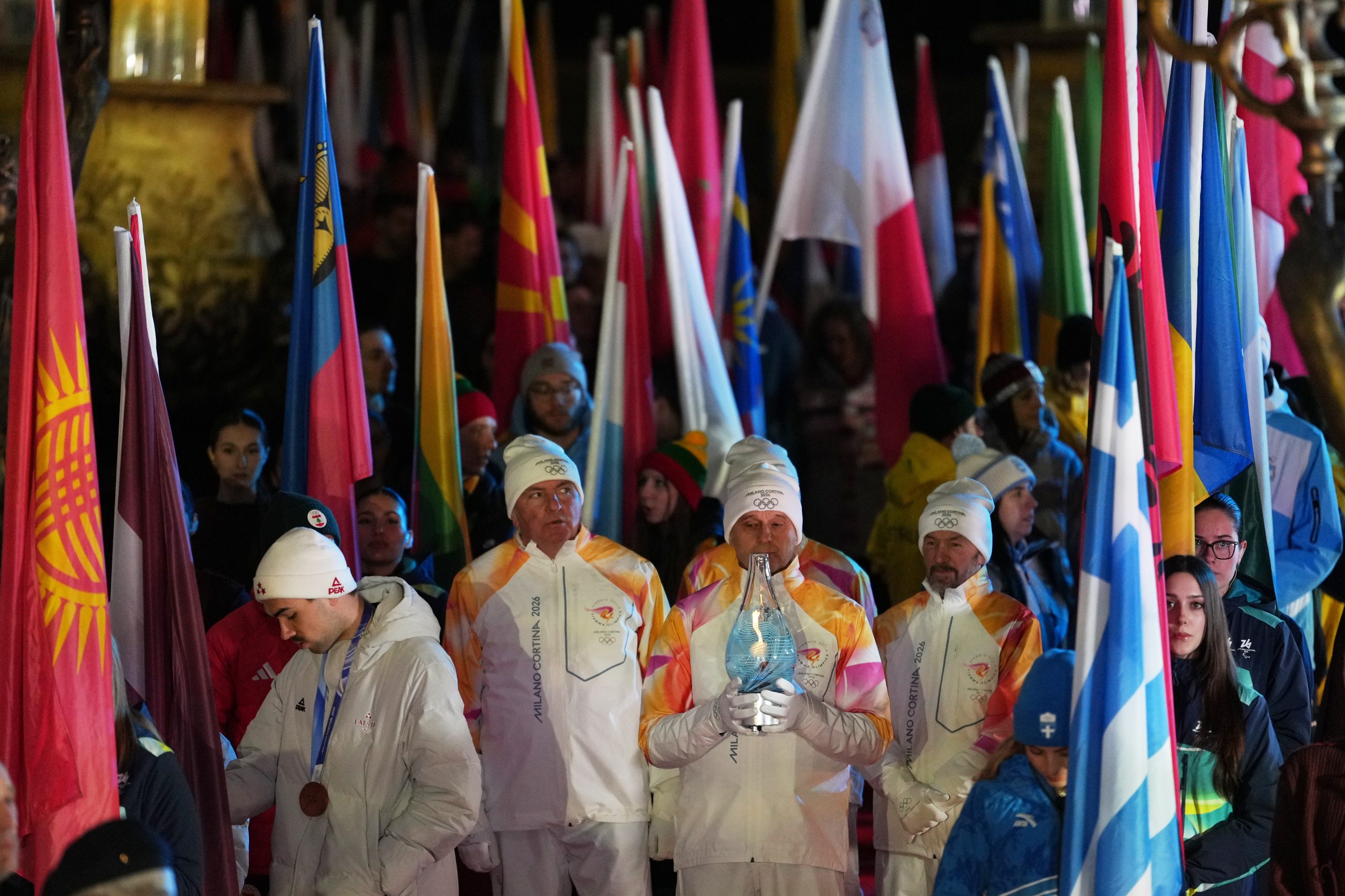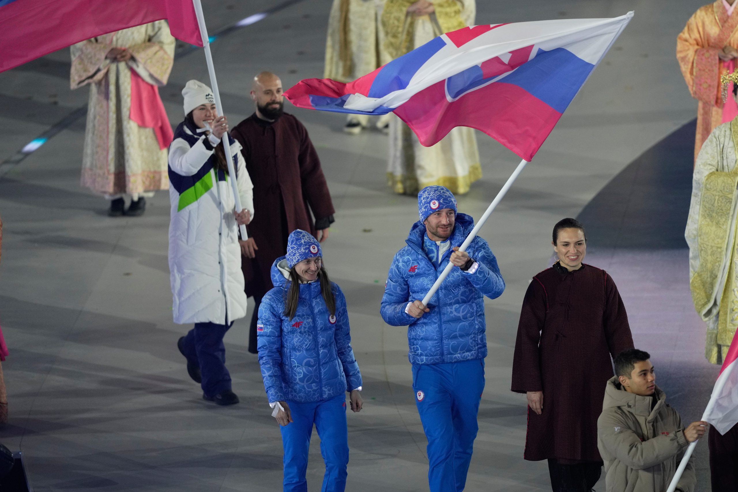 Slovenskí skialpinisti Jakub Šiarnik a Rebeka Cullyová so slovenskou vlajkou počas záverečného ceremoniálu ZOH 2026.