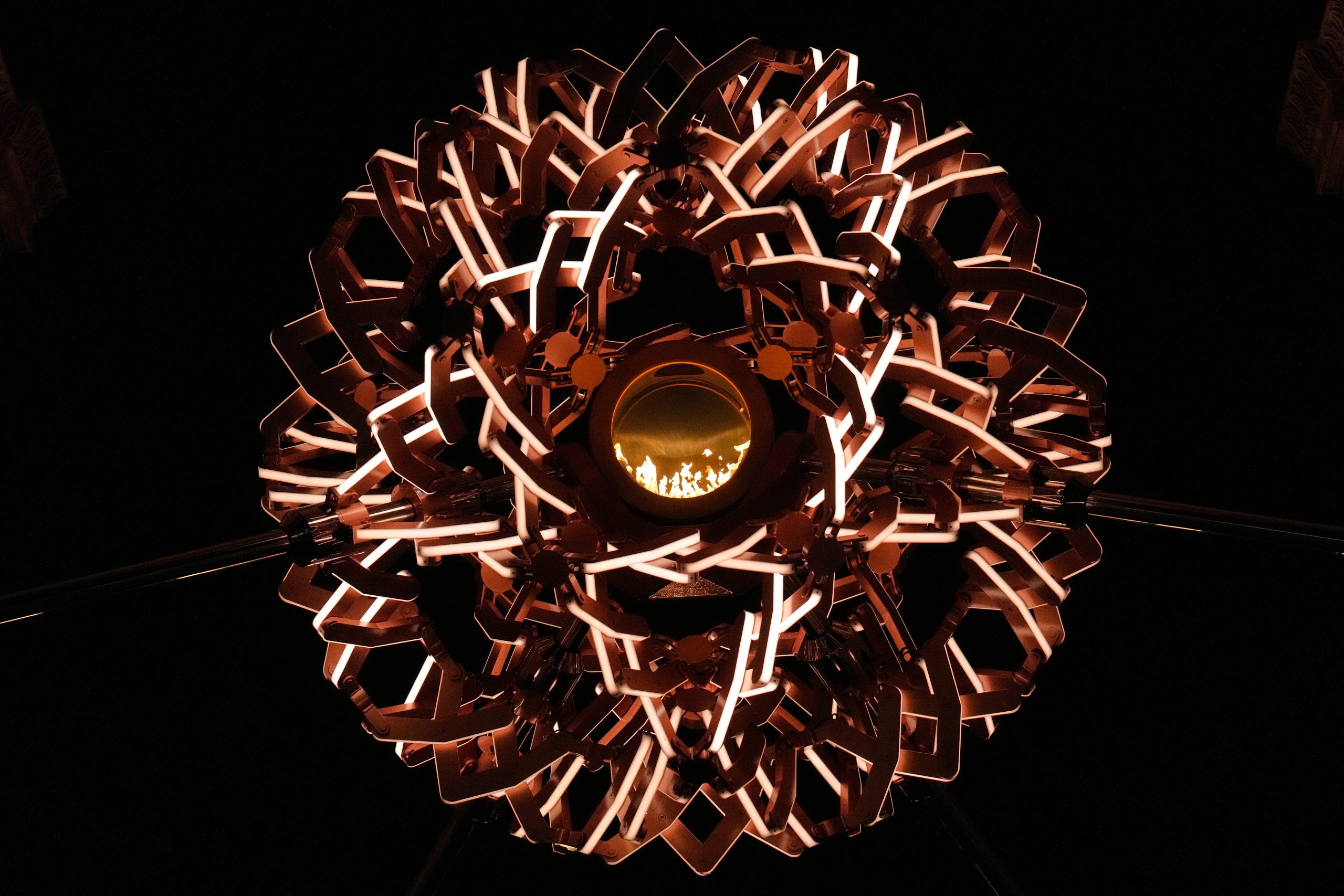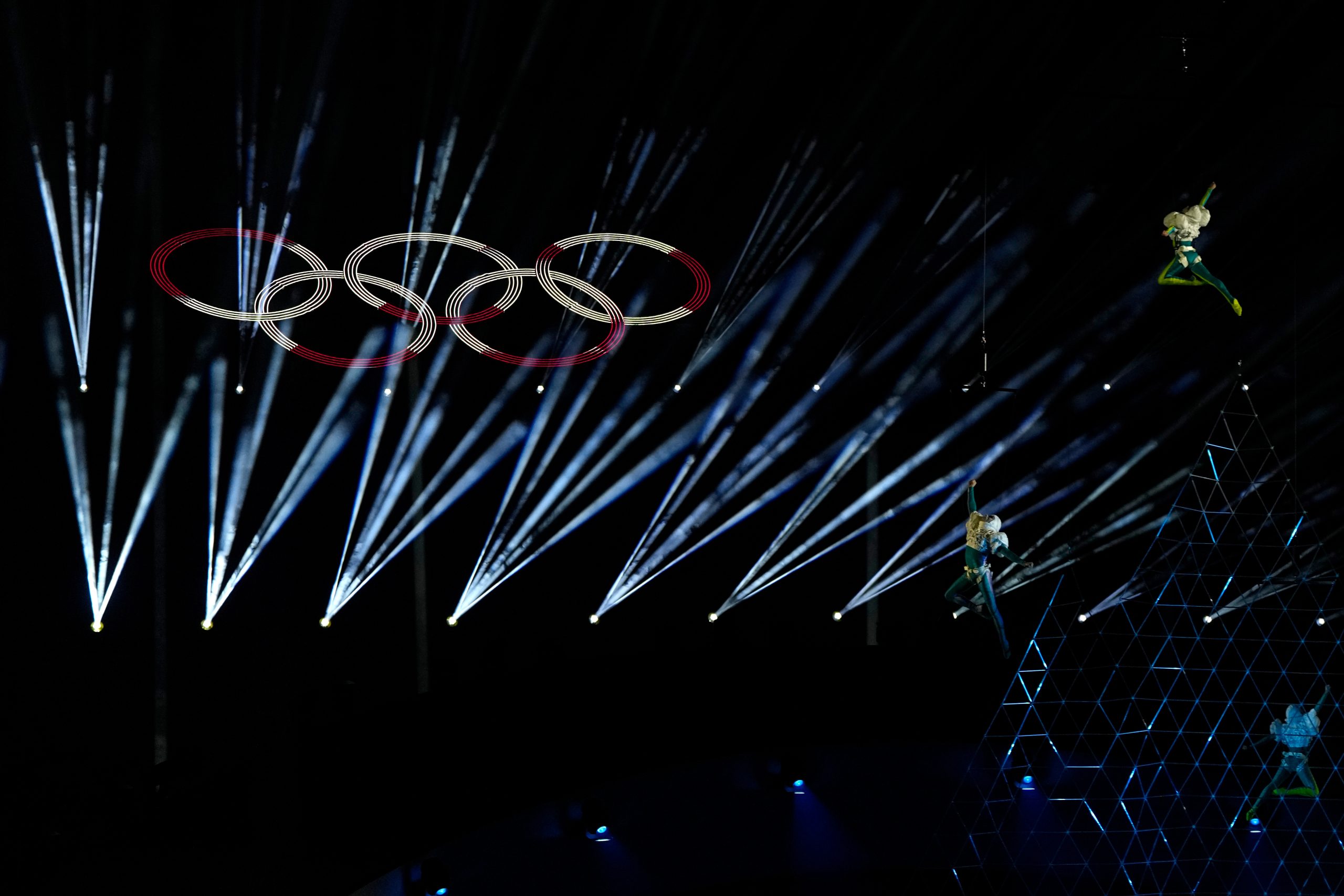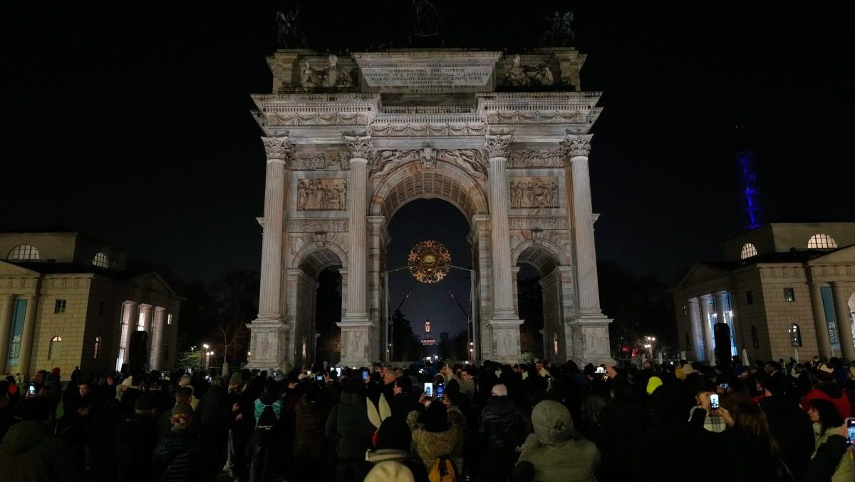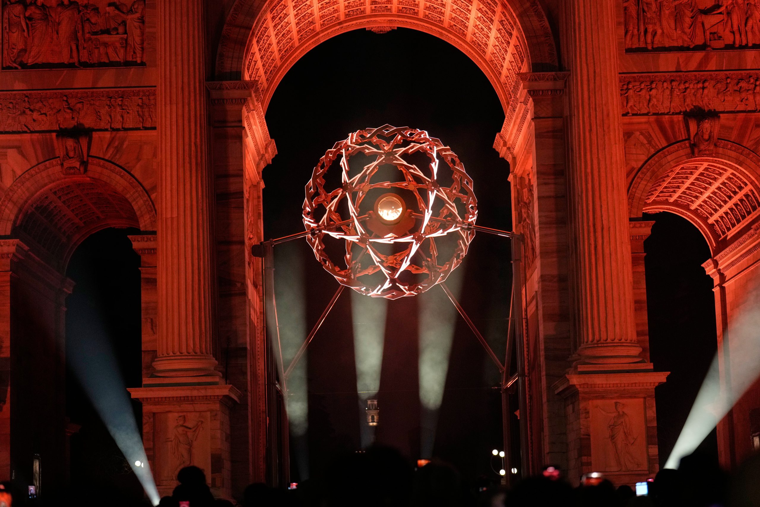 Oblúk mieru (Arco della Pace) po zhasnutí olympijského ohňa počas záverečného ceremoniálu zimných olympijských hier v Miláne.