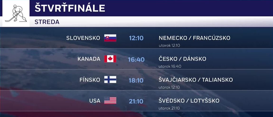 Víťaz súboja Česko – Dánsko sa vo štvrťfinále stretne s Kanadou. Úspešnejší z duelu Švédsko – Lotyšsko narazí na USA. Fínov čaká víťaz zápasu Švajčiarsko – Taliansko.