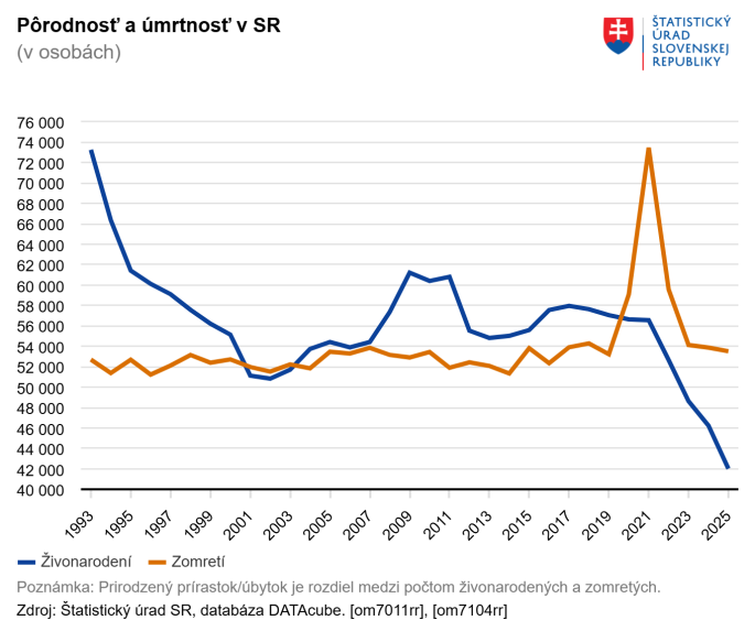 Hlavným faktorom poklesu populácie SR bol podľa ŠÚ v roku 2025 prirodzený úbytok obyvateľstva. V priebehu minulého roka sa v SR narodilo 42-tisíc živých detí, ale zomrelo až viac ako 53 500 ľudí. Celkovo za posledných šesť rokov ubudlo v krajine prirodzeným pohybom takmer 51-tisíc obyvateľov.