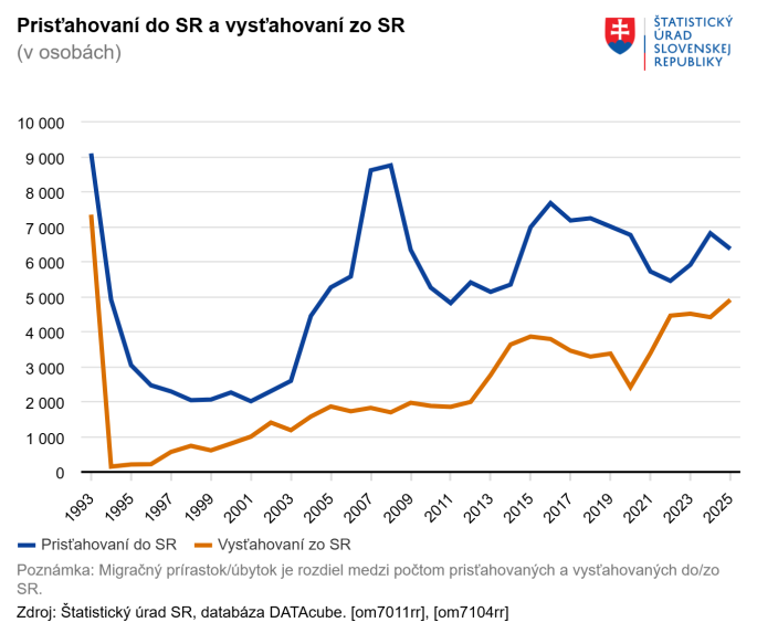V roku 2025 sa na Slovensko prisťahovalo na trvalý pobyt takmer 6 400 ľudí a vysťahovalo sa vyše 4 900 osôb.